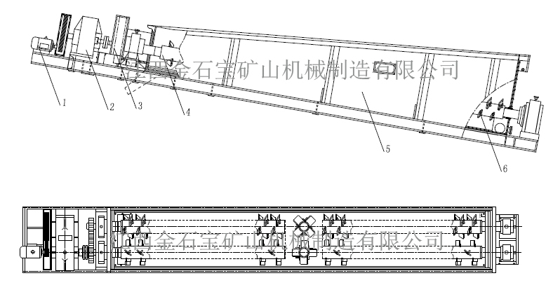 1.电机  2. 减速机  3. 齿轮  4. 传动轴  5. 槽体  6. 搅拌叶片