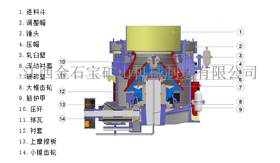 圆锥破碎机结构简介:圆锥破碎机其结构主要有机架水平轴、动锥体、平衡轮、偏心套、上破碎壁(固定锥)、下破碎壁(动锥)、液力偶合器、润滑系统、液压系统。